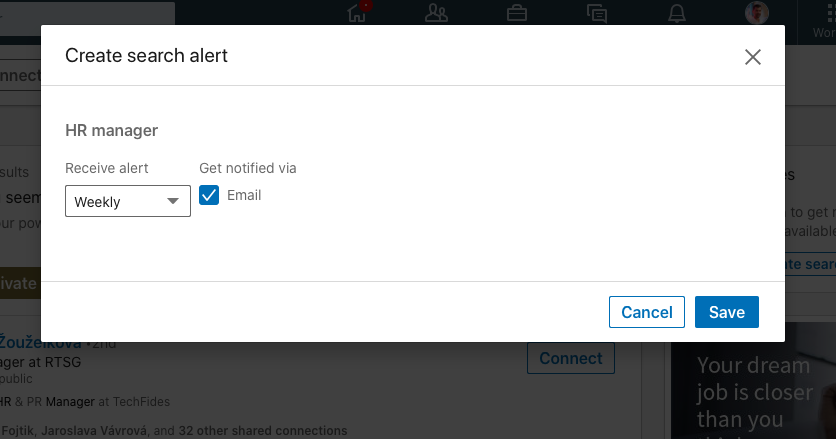Saved searches (Uložené hledání) vám umožní se nejen vrátit k vyhledávacím dotazům, které díky podmínkám AND, OR nebo NOT (představené minule), mohou být dost složité, ale také si můžete zvolit možnost automatického zasílání do emailu. Linkedin vám pak začne posílat tzv. přírůstkovou databázi lidí do vašeho mailu a vy nemusíte hledat pořád dokola. Přírůstkovou myslíme to, že vám Linkedin pošle vždy lidi, kteří do vaší podmínky spadnou nově třeba za poslední týden. A to vám může ušetřit pěkných pár desítek minut týdně.